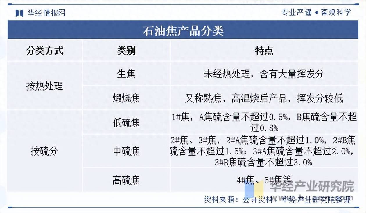 未经热处理的生石油焦,氢、硫、氧等元素含量高,经过煅烧后,挥发分大幅降低,硫分也会下降0.2-0.5%,生产出熟焦,又称煅后焦,预焙阳极、石墨电极的石油焦原料主要是煅烧焦。石油焦按照硫含量的高低可以分为高硫焦,中硫焦和低硫焦。石油焦中硫分的高低,对下游应用影响非常大,硫分越低应用领域越高端,根据硫分含量,石油焦分为1#焦、2#焦、3#焦、4#焦等。