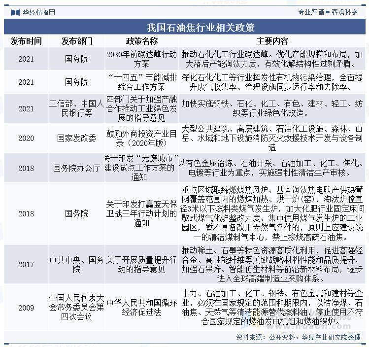 近些年来,为了促进石油焦行业的健康发展,我国政府部门发布了《中华人民共和国循环经济促进法》、《关于印发打赢蓝天保卫战三年行动计划的通知》、《关于印发“无废城市”建设试点工作方案的通知》等政策。