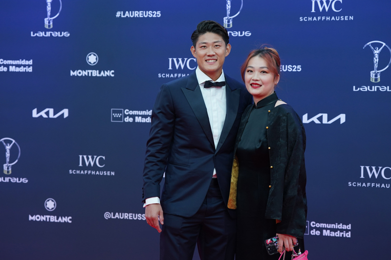 4月21日,中国网球运动员张之臻(左)与妻子张思昊一同出席红毯仪式。\n 当日,2025劳伦斯世界体育奖颁奖典礼在西班牙马德里举行。\n 新华社记者 彭子洋 摄
