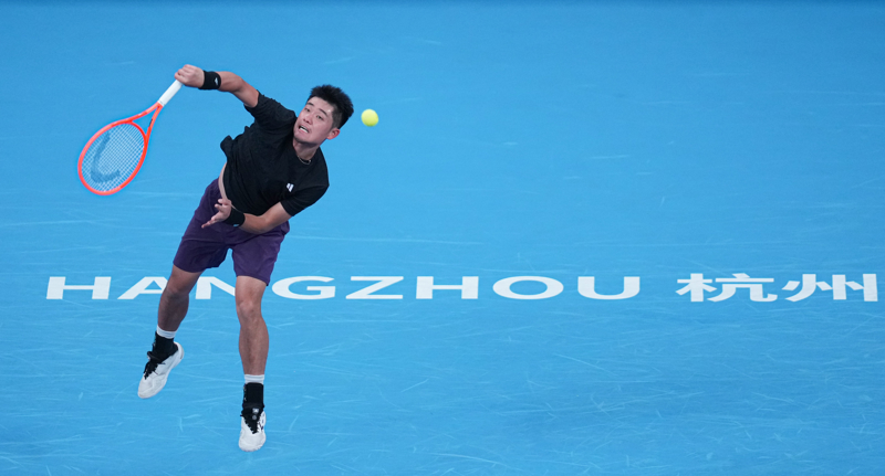 9月21日,中国选手吴易昺在比赛中发球。\n 当日,在浙江杭州进行的男子职业网球协会(ATP)250杭州网球公开赛单打四分之一决赛中,中国选手吴易昺2比1战胜俄罗斯选手梅德韦杰夫,晋级四强。\n 新华社发