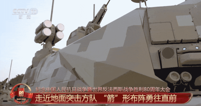 在所有参阅的装备方队里,地面突击方队是第一个驶过天安门广场的,和其他方队使用的矩形编队不同,他们拥有一个独特的队形,酷似一支射向前方的“利箭”。而组成这支“利箭”的是三款全新亮相的突击装备。