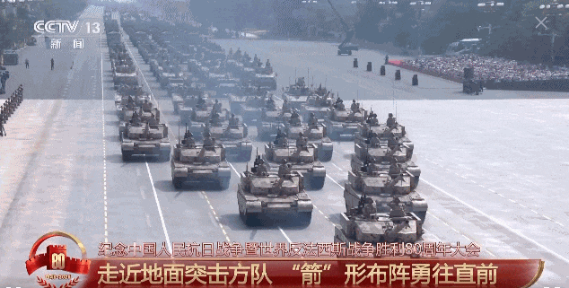 在这次阅兵中,由99B坦克、100坦克、100支援战车编成的地面突击方队呈“箭”形布阵,寓意打赢之箭、胜利之箭。