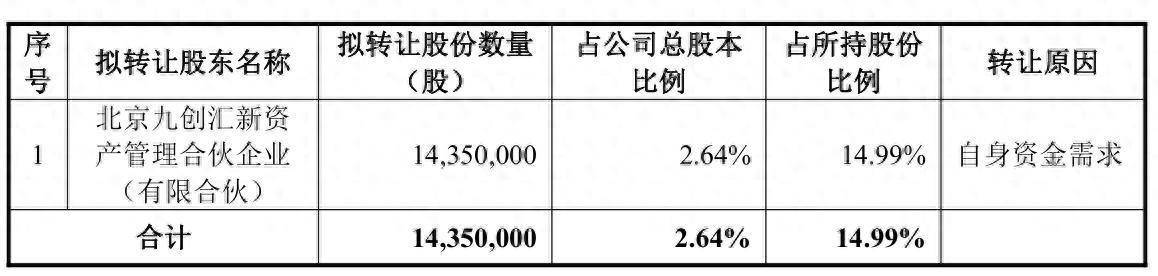 截至公告披露日,北京九创汇新资产管理合伙企业(有限合伙)持有公司9571.95万股,占公司总股本比例的17.63%,为公司第二大股东。