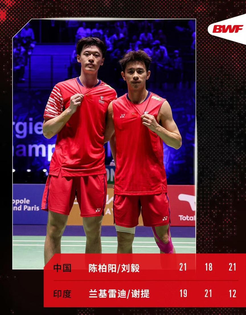 首局中国组合把握住关键分,以21-19先下一城;次局印度组合在局末发力,以21-18扳平比分。决胜局陈柏阳、刘毅开局确立领先并始终保持优势,以21-12锁定胜局,晋级决赛。他们将在决赛中对阵韩国组合金元昊、徐承宰。